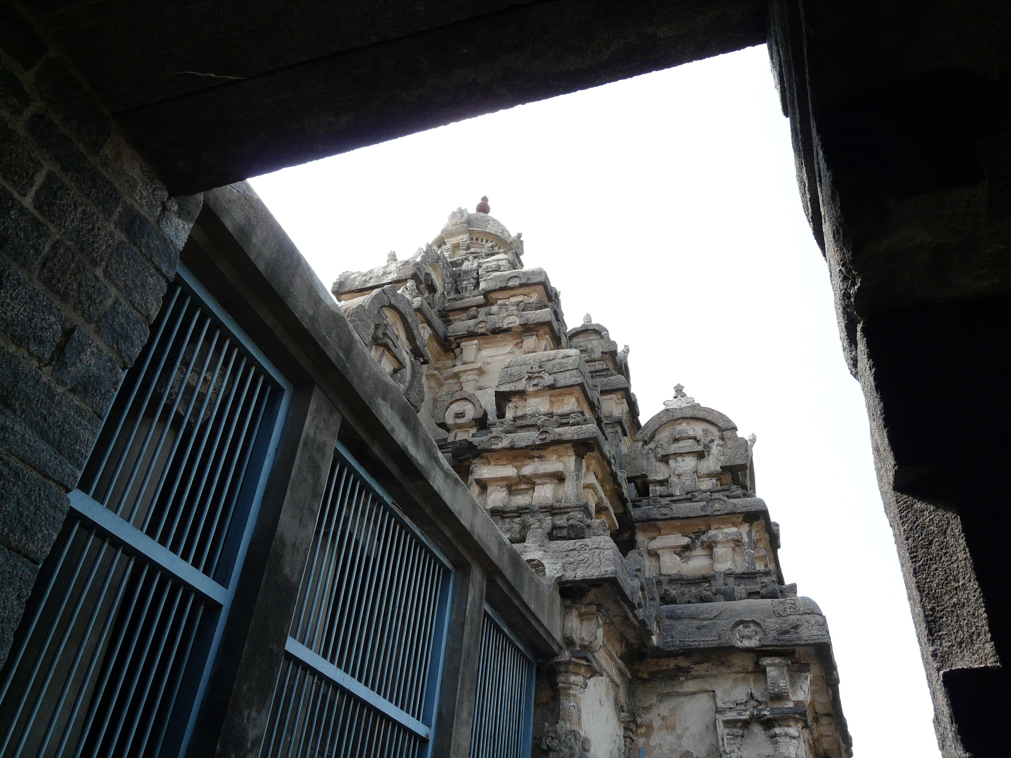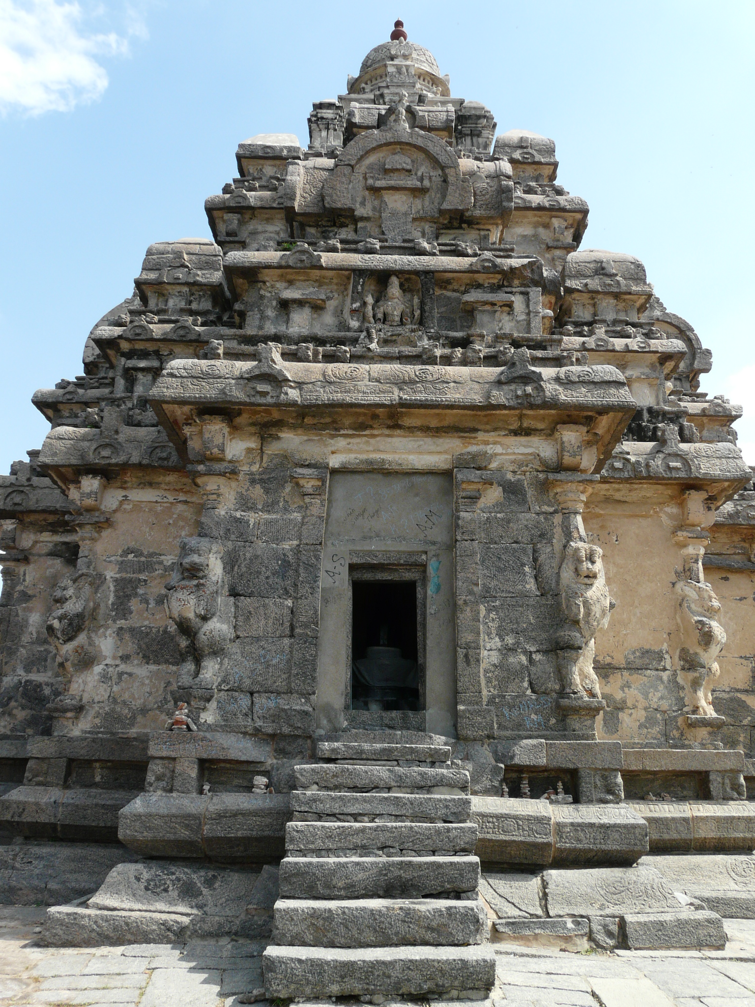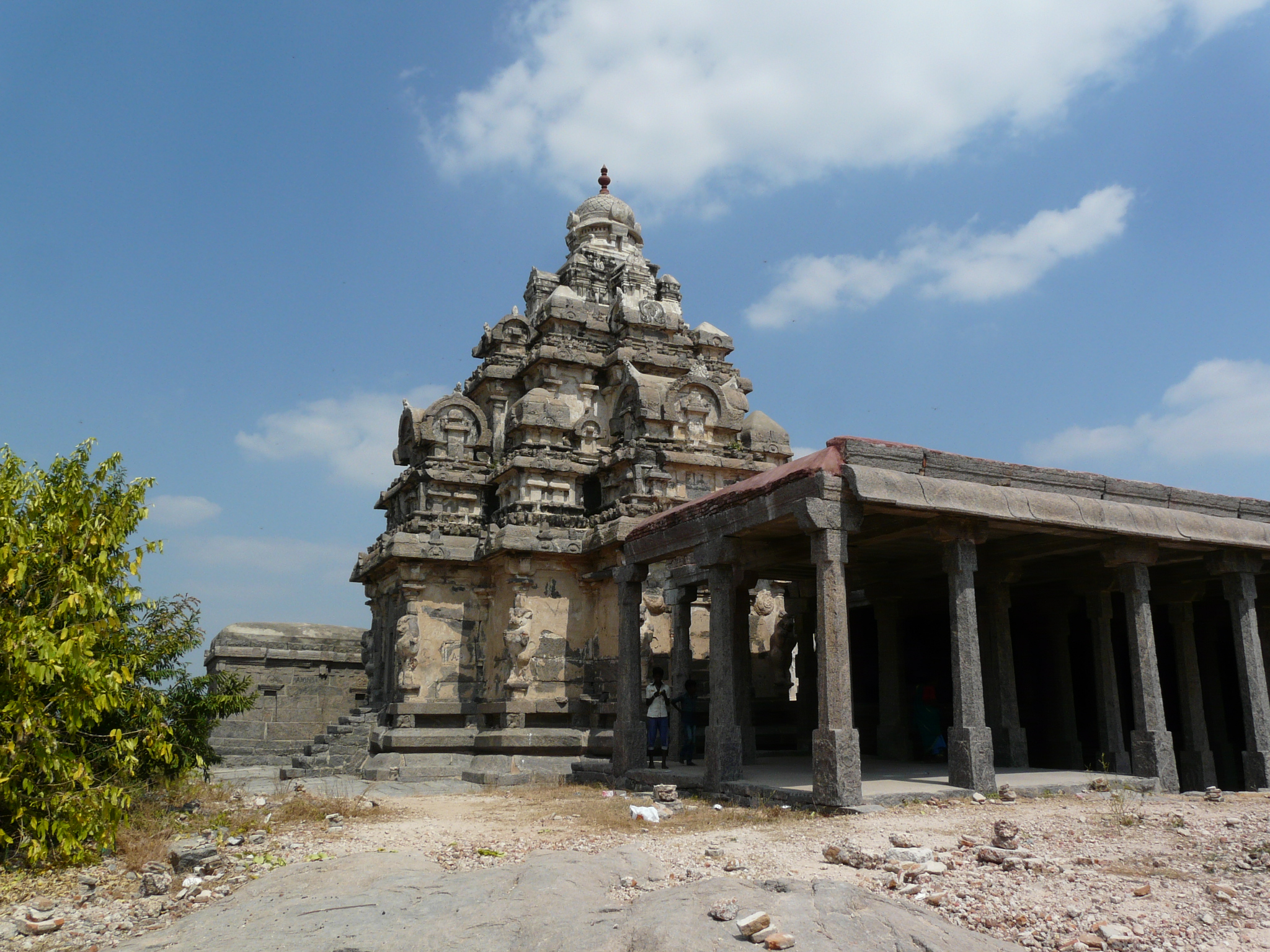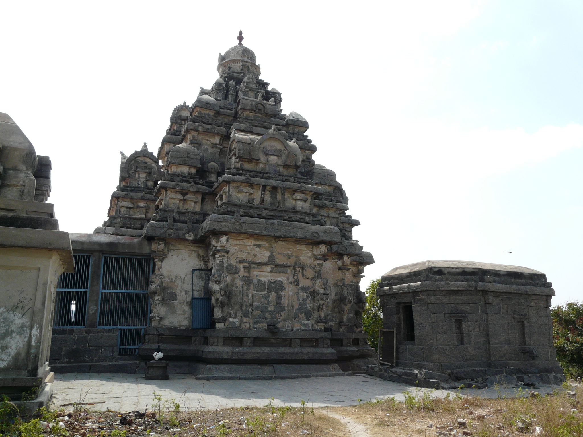 Near the village of Panamalai is located an early-8th c AD Pallava temple known as Talagirishwara. It is situated on a granite outcrop next to a lake (hence the name). Like the Kanchipuram Pallava temples that it is contemporaneous with, and unlike the later Uttiramerur Pallava temples, Talagirishwara has the rearing-lion-yali sculptures on its sanctuary outer walls. Only the sanctuary structure is from the Pallava era, the adjoining mandapa and shrines are from the Vijaynagar period.