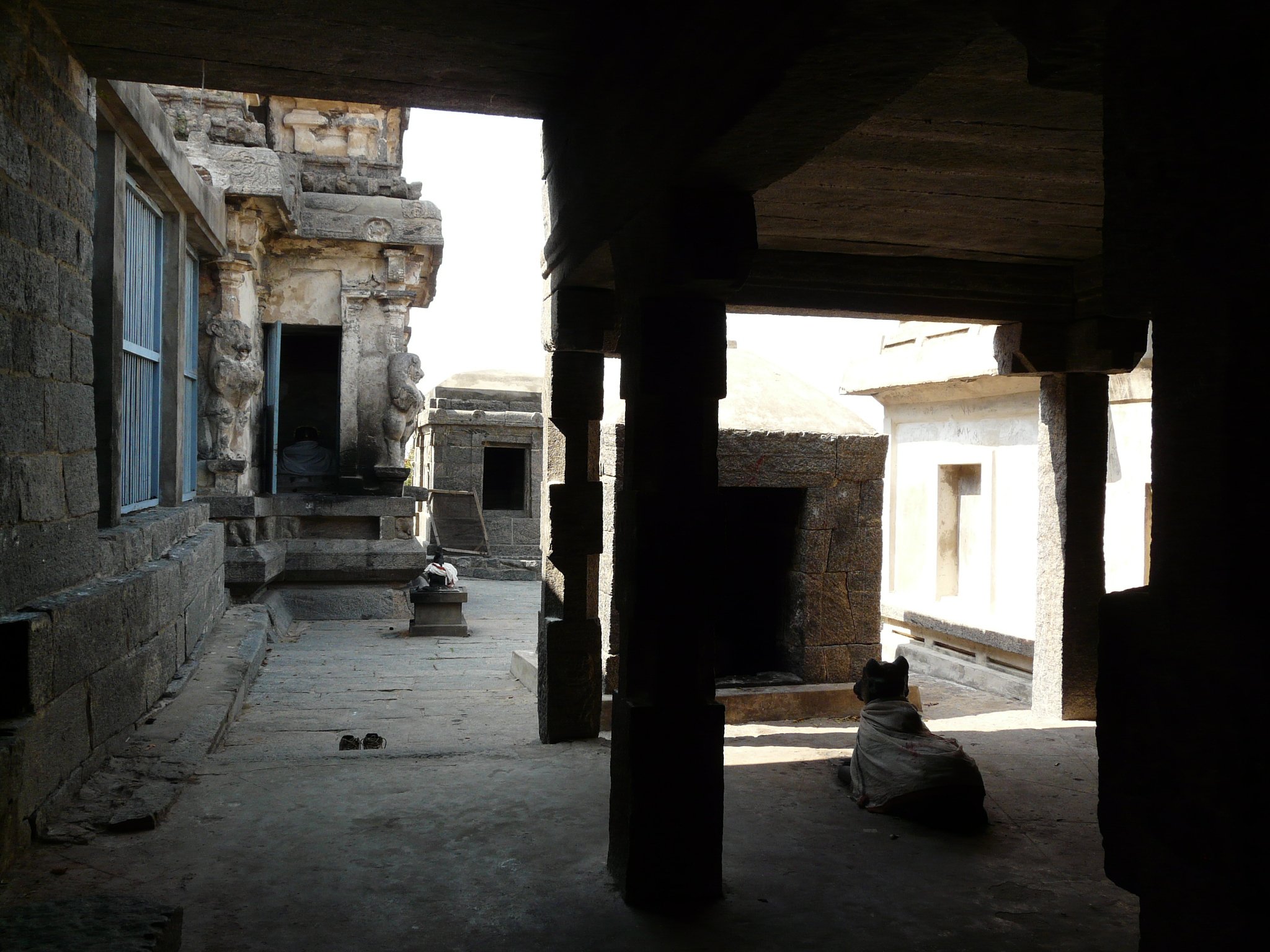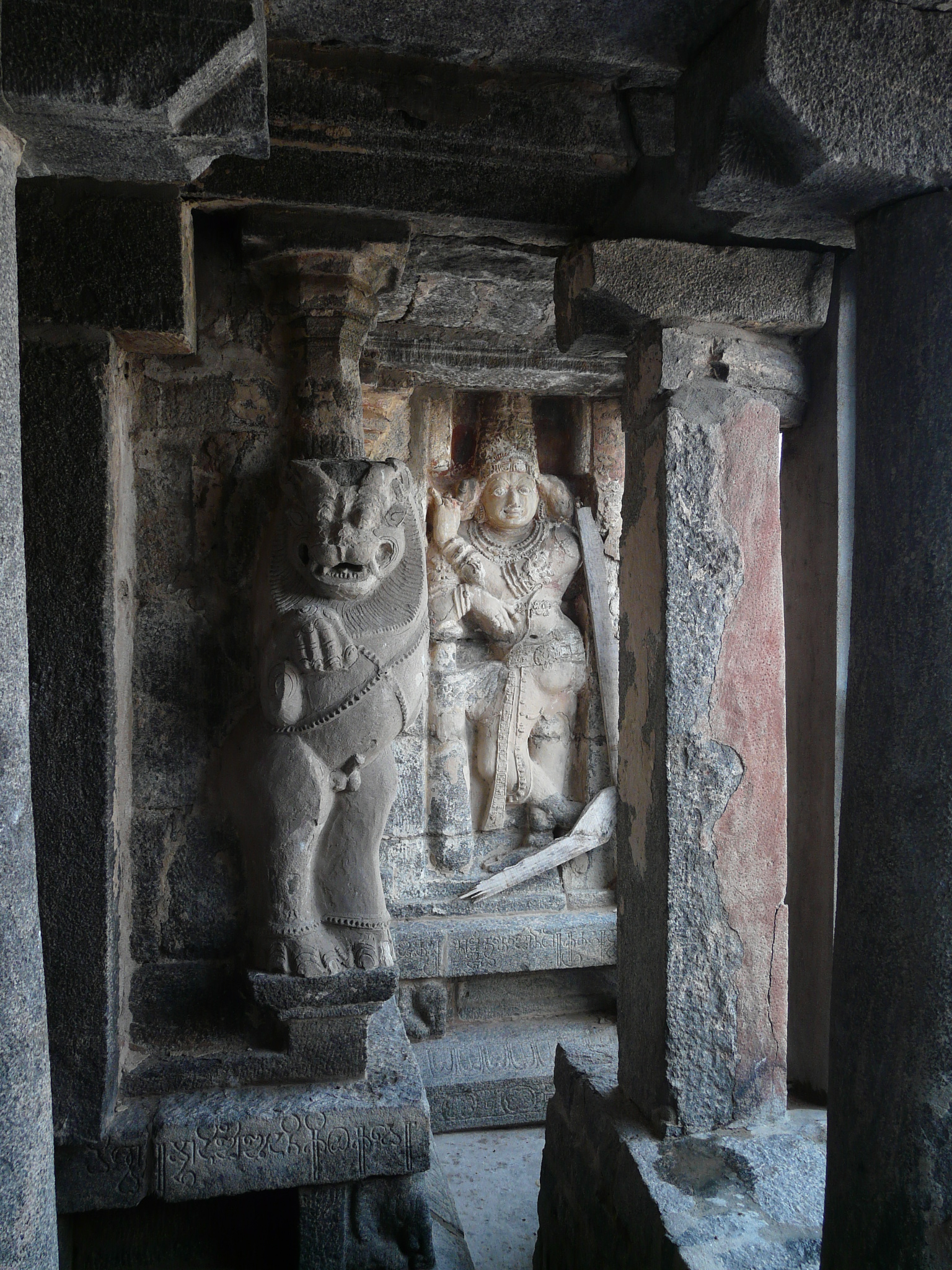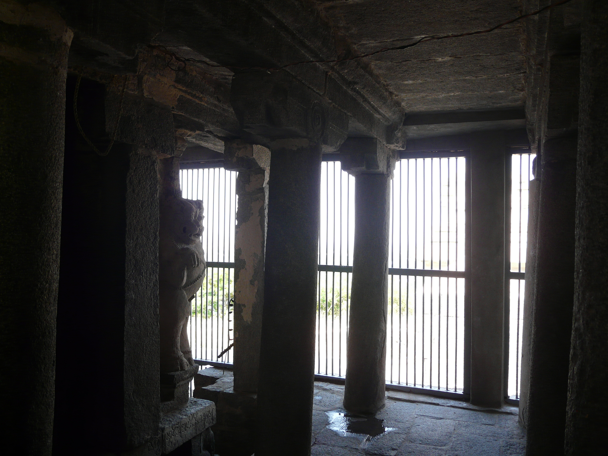 Near the village of Panamalai is located an early-8th c AD Pallava temple known as Talagirishwara. It is situated on a granite outcrop next to a lake (hence the name). Like the Kanchipuram Pallava temples that it is contemporaneous with, and unlike the later Uttiramerur Pallava temples, Talagirishwara has the rearing-lion-yali sculptures on its sanctuary outer walls. Only the sanctuary structure is from the Pallava era, the adjoining mandapa and shrines are from the Vijaynagar period.